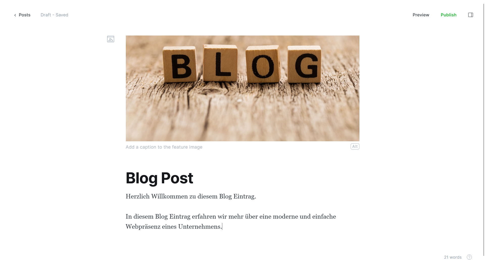 Unsere Webpräsenz-Lösung, basierend auf Ghost, ermöglicht es, ohne tieferes technisches Know-How, eine beeindruckende Online-Präsenz aufzubauen und zu verwalten. Die Lösung bietet die Werkzeuge und Funktionen, um hochwertige Webseiten zu erstellen, die die Botschaften des Unternehmens effektiv vermitteln. Mit der Lösung gelingt die Inhaltsverwaltung mit Leichtigkeit und man hat dabei viel Flexibilität beim Design, während man gleichzeitig von den neuesten technischen Entwicklungen profitiert.
