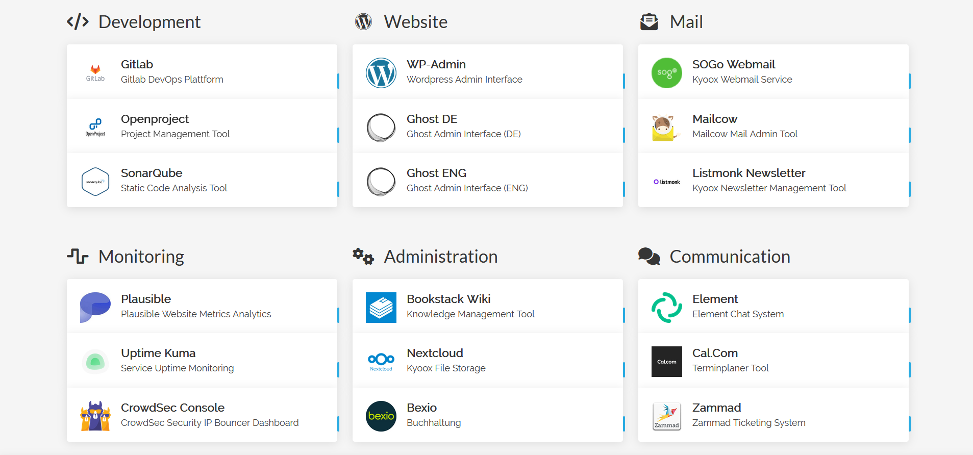 Das Kyoox Cockpit ist Ihre Antwort auf die Herausforderungen der modernen Unternehmensführung. Es ist die perfekte Lösung für Unternehmen, die nach einer effizienten Möglichkeit suchen, ihre Webtools zu organisieren und den Zugriff zu optimieren.